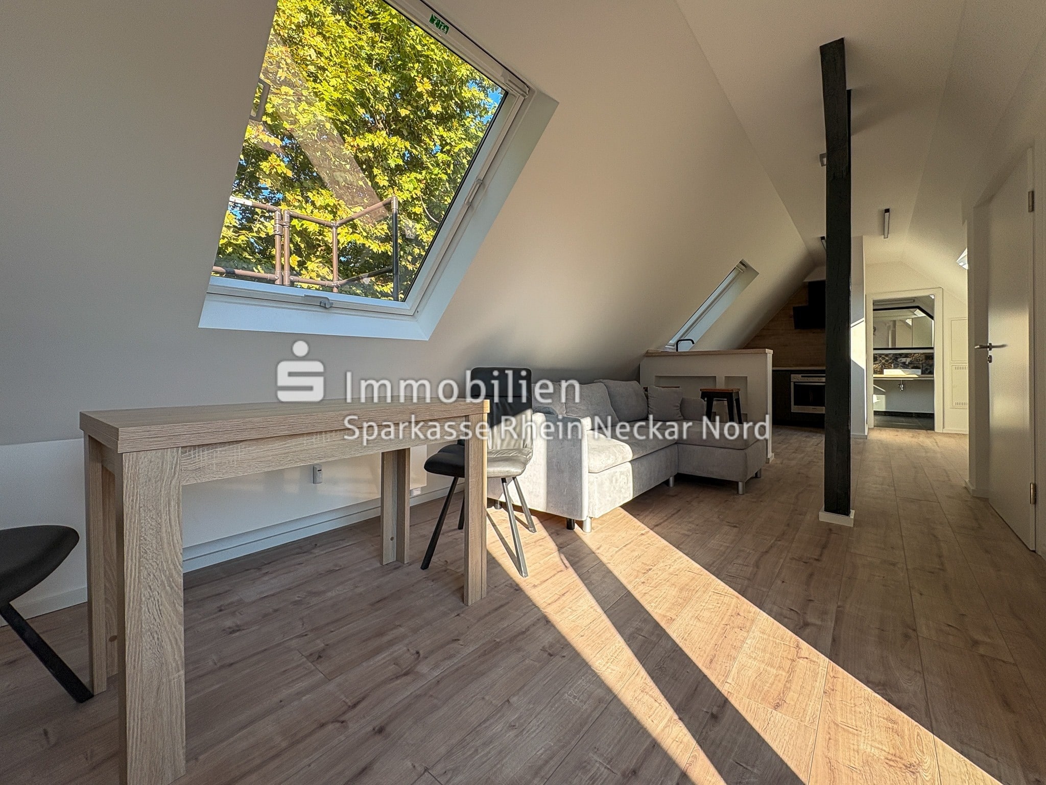 Das lichtdurchflutete Wohn- und Esszimmer mit offenen Dachschrägen und großen Fensterflächen schafft ein luftiges Wohngefühl. Der hochwertige Vinylboden in Holzoptik verleiht dem Raum eine warme, natürliche Note und harmoniert ideal mit den modernen Möbeln.