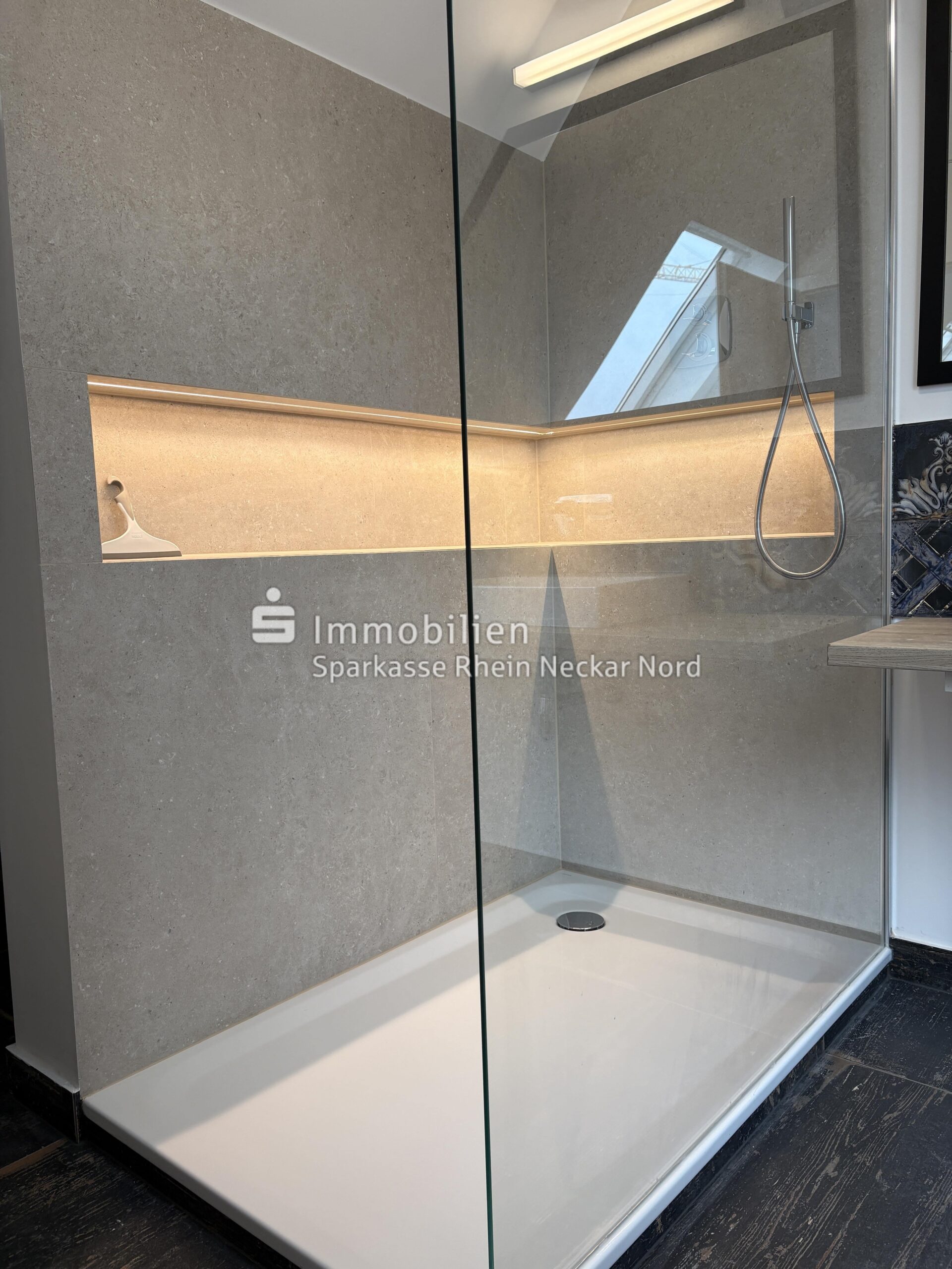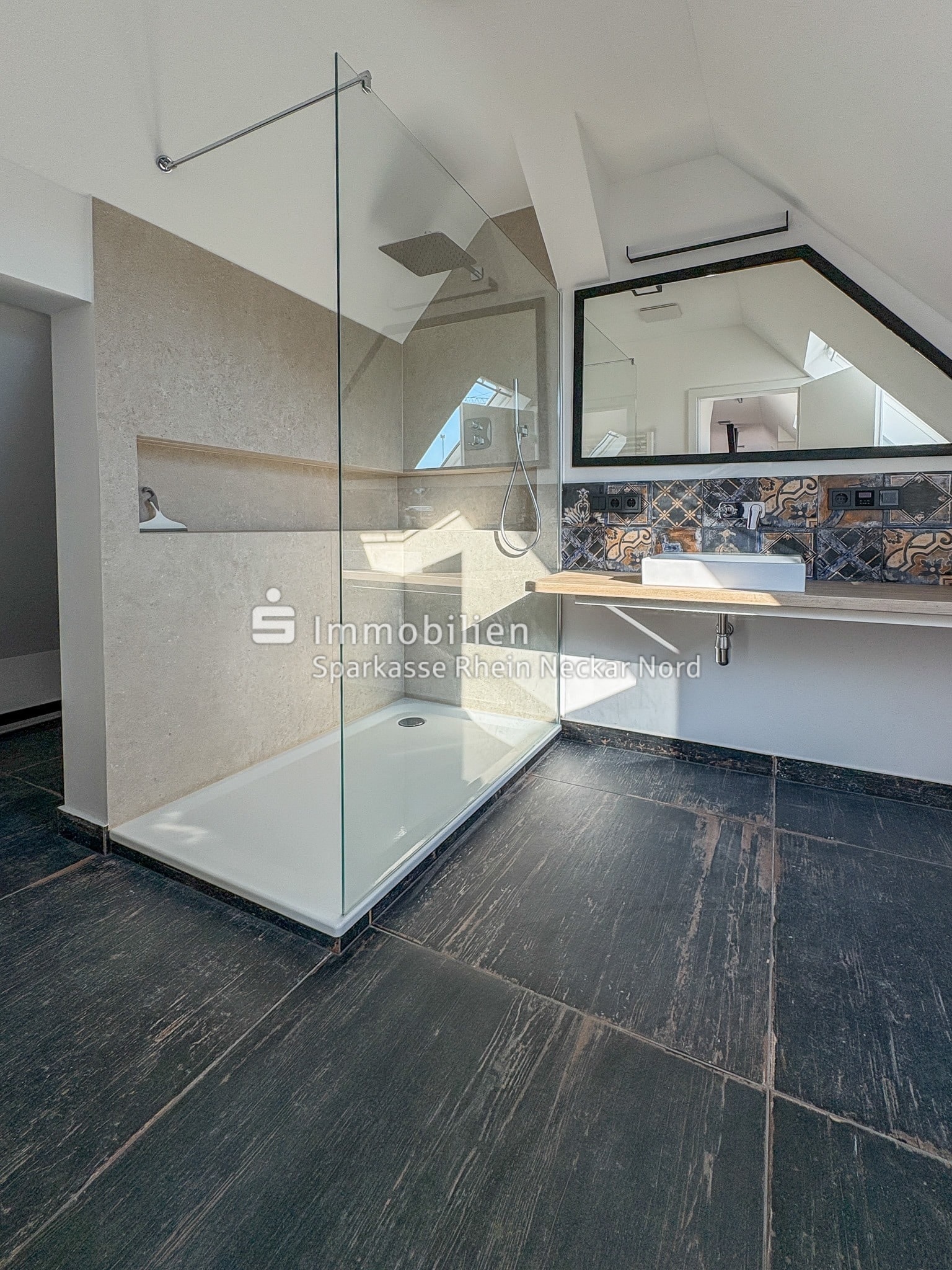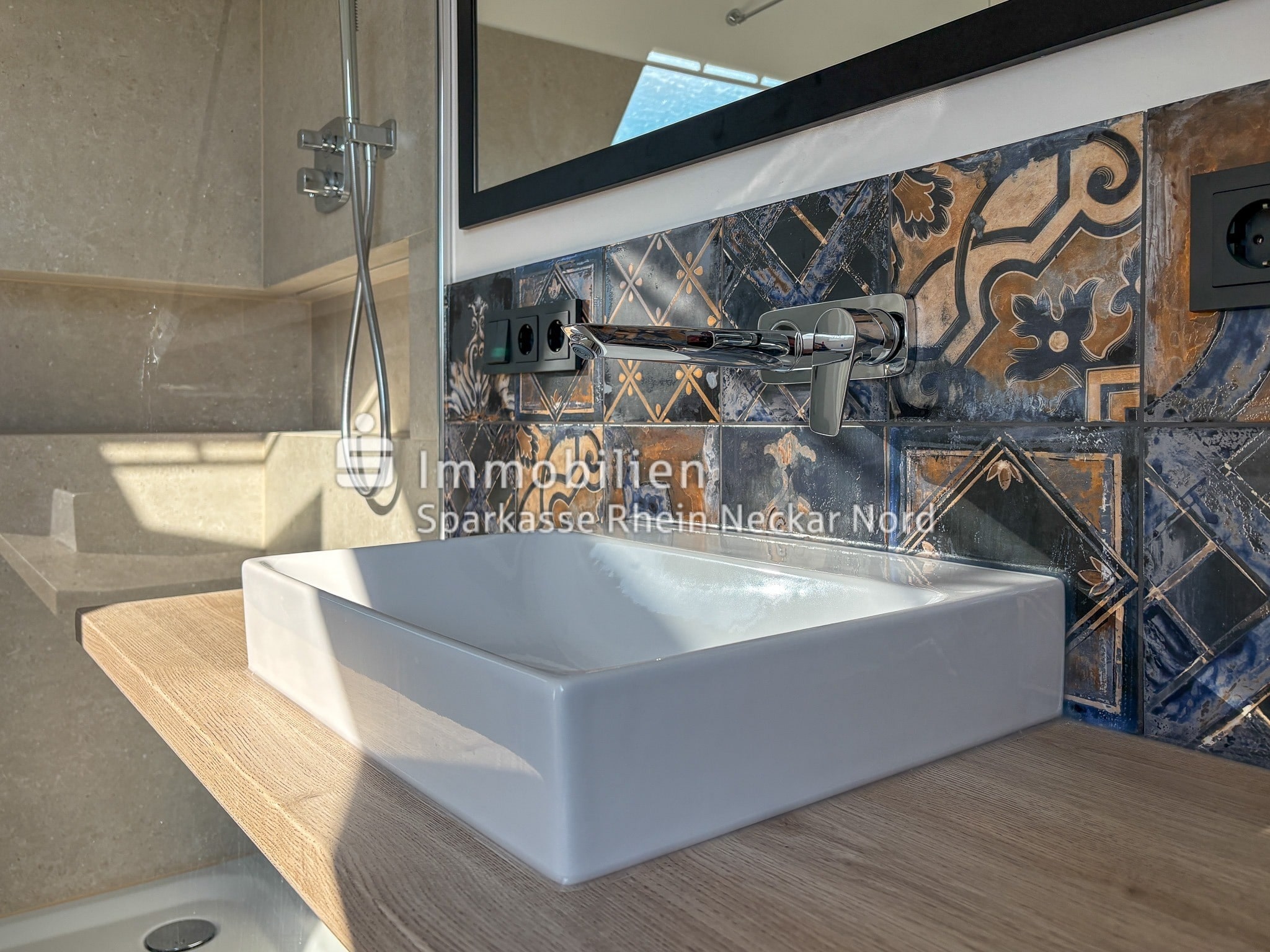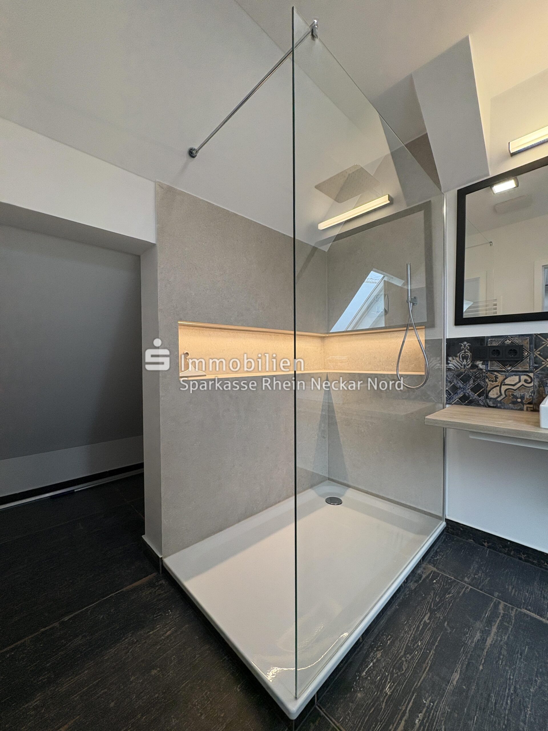 Das Badezimmer ist ein echtes Highlight: Mit seinen eleganten, großformatigen Fliesen, einer ebenerdigen Dusche mit Echtglasabtrennung und exklusiver Beleuchtung, eingebautem Wandradio, stilvollen Dekorfliesen mit Ornamentoptik und einem modernen Aufsatzwaschbecken präsentiert es sich wie aus einem Designmagazin.