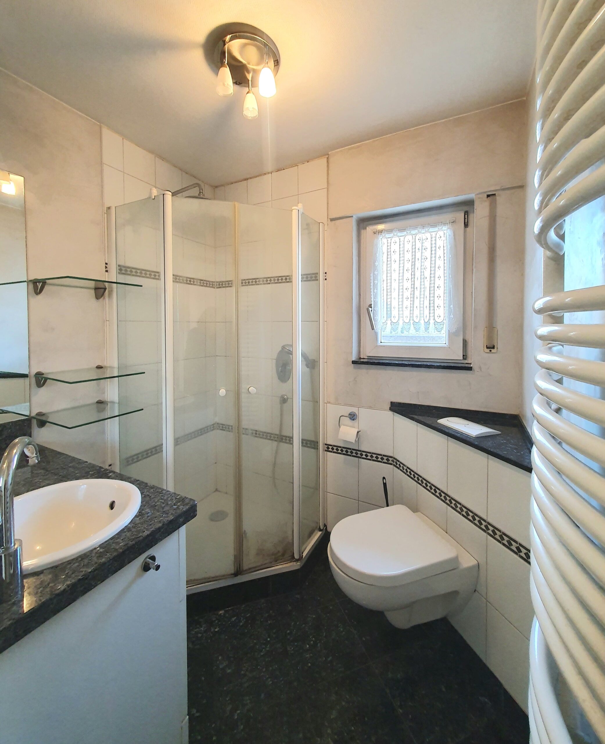 - Badausstattung: Dusche, Fenster