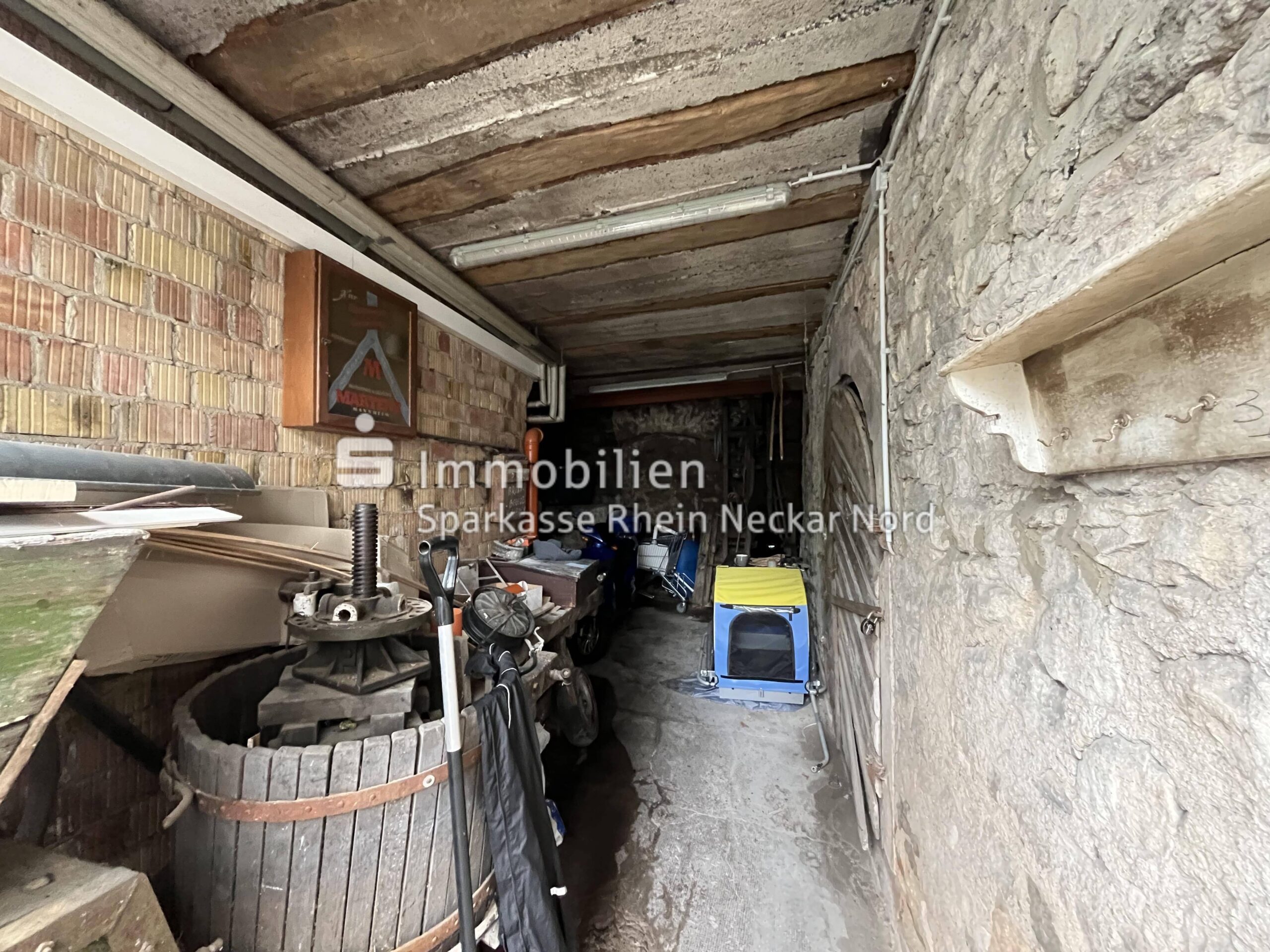 Unter der Wohnung im Erdgeschoß befindet sich ein Kellerraum. Ein weiterer, damals als Wein-Gewölbekeller für die Schnapsbrennerei genutzter Keller mit Zugang aus dem größeren Innenhof im Eingangsbereich, gehört ebenso zu dieser geräumigen Immobilie wie der kleine hintere Innenhof am kühlenden bewachsenen Hang.