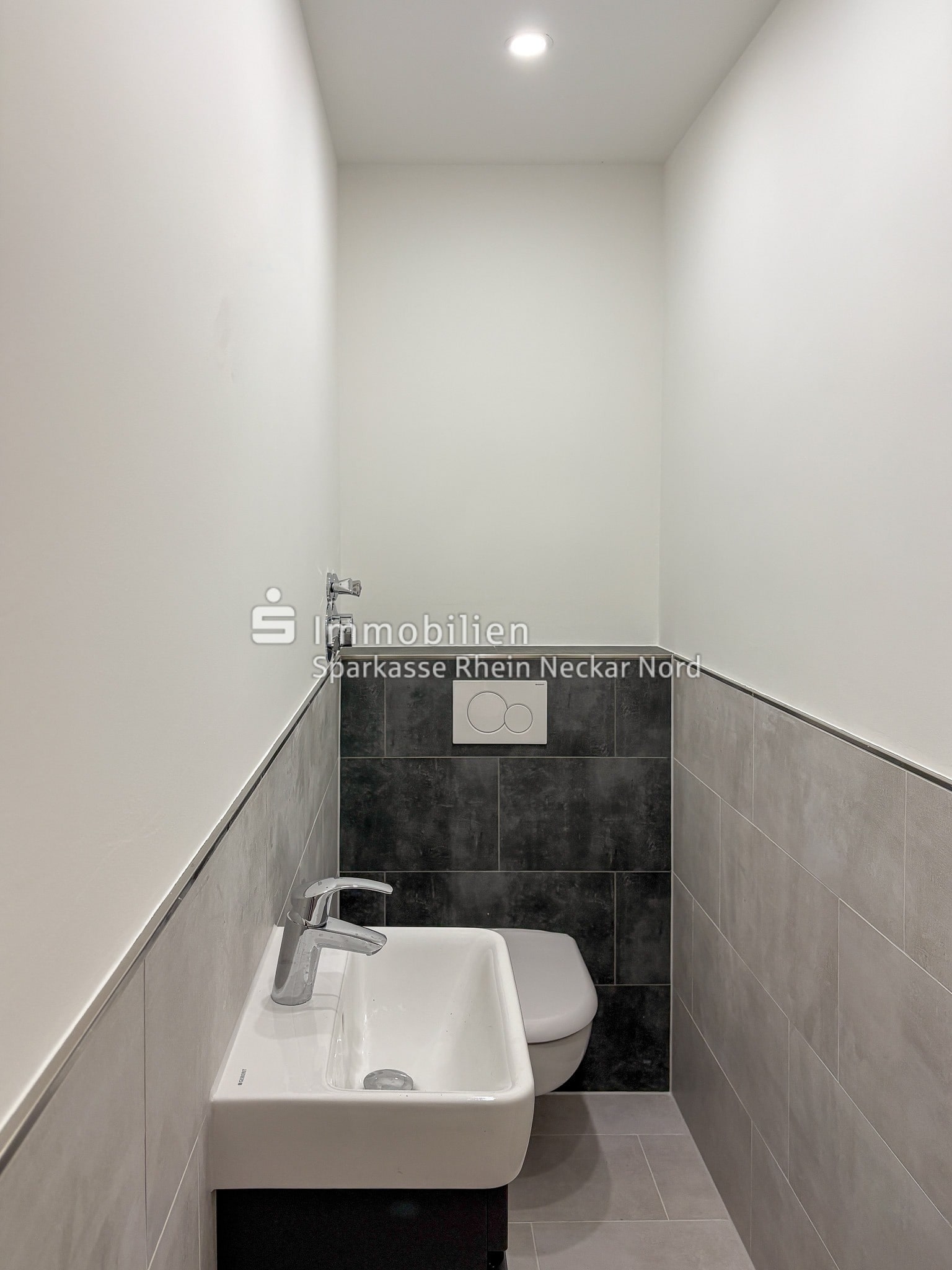 Ergänzt wird der Sanitärbereich durch ein separates WC, das ebenfalls neu gestaltet und mit einer eleganten Kombination aus hellen und dunklen Fliesen versehen wurde. Auch hier sorgt eine integrierte Deckenbeleuchtung für ein modernes, klares Lichtbild.