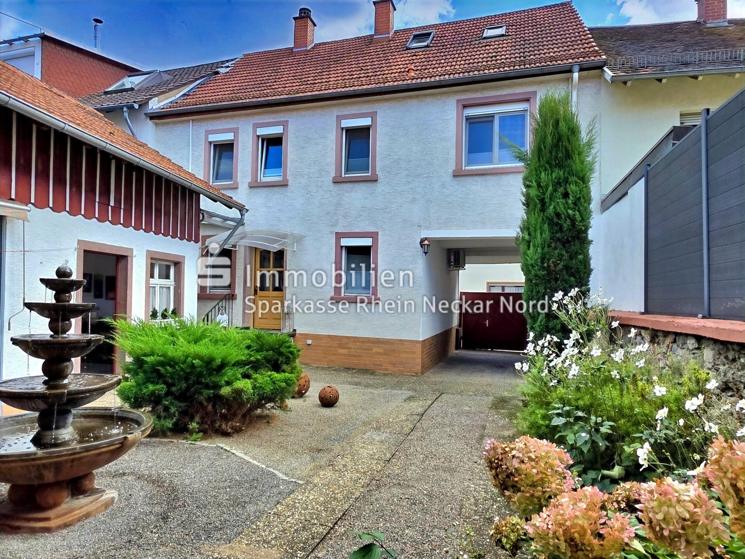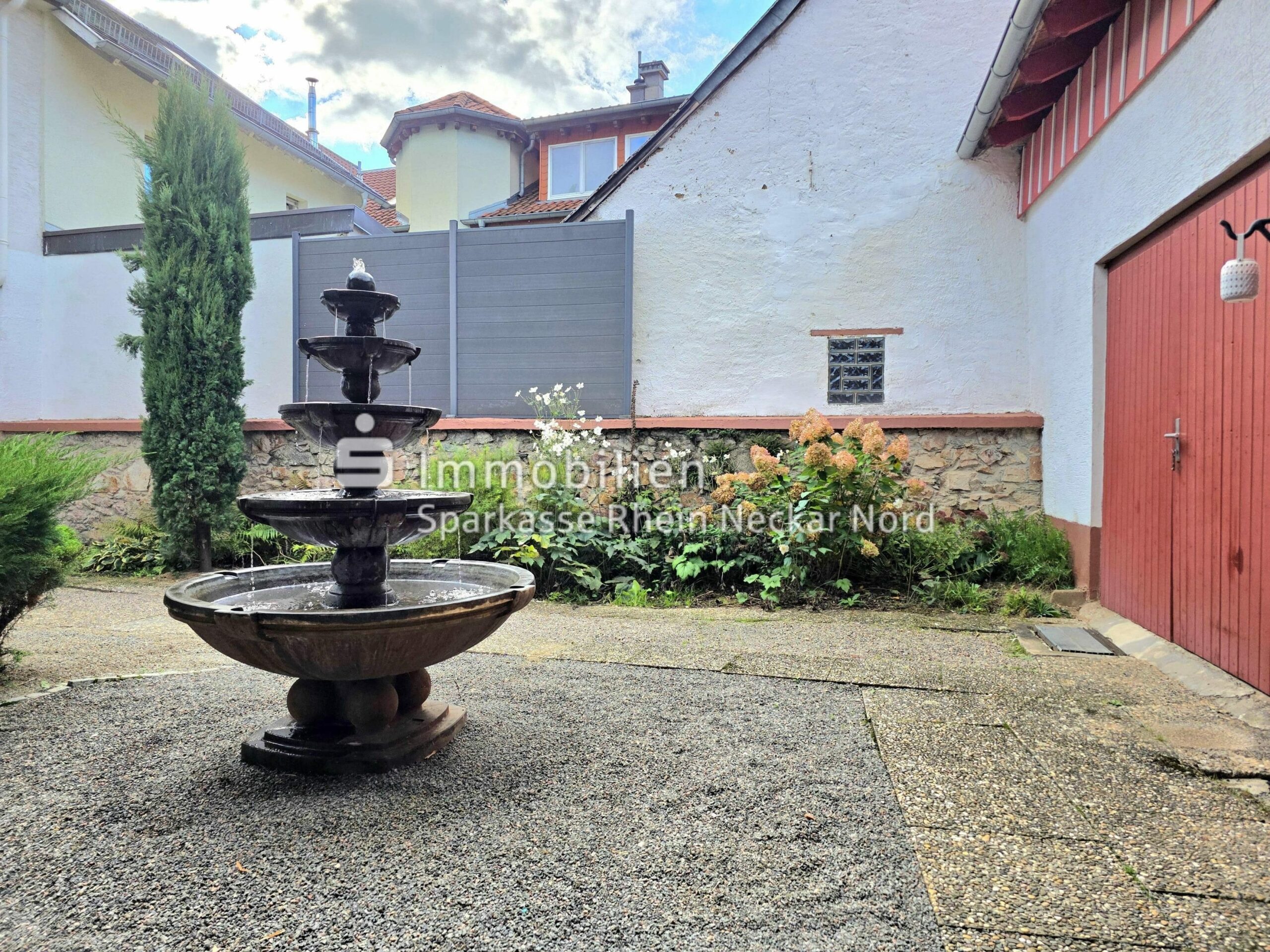 Der in sich geschlossene Innenhof mit einer hübschen Brunnenanlage erinnert an charmante mediterrane Innenhöfe. Holen Sie sich ein Stück Urlaubsfeeling nach Hause.