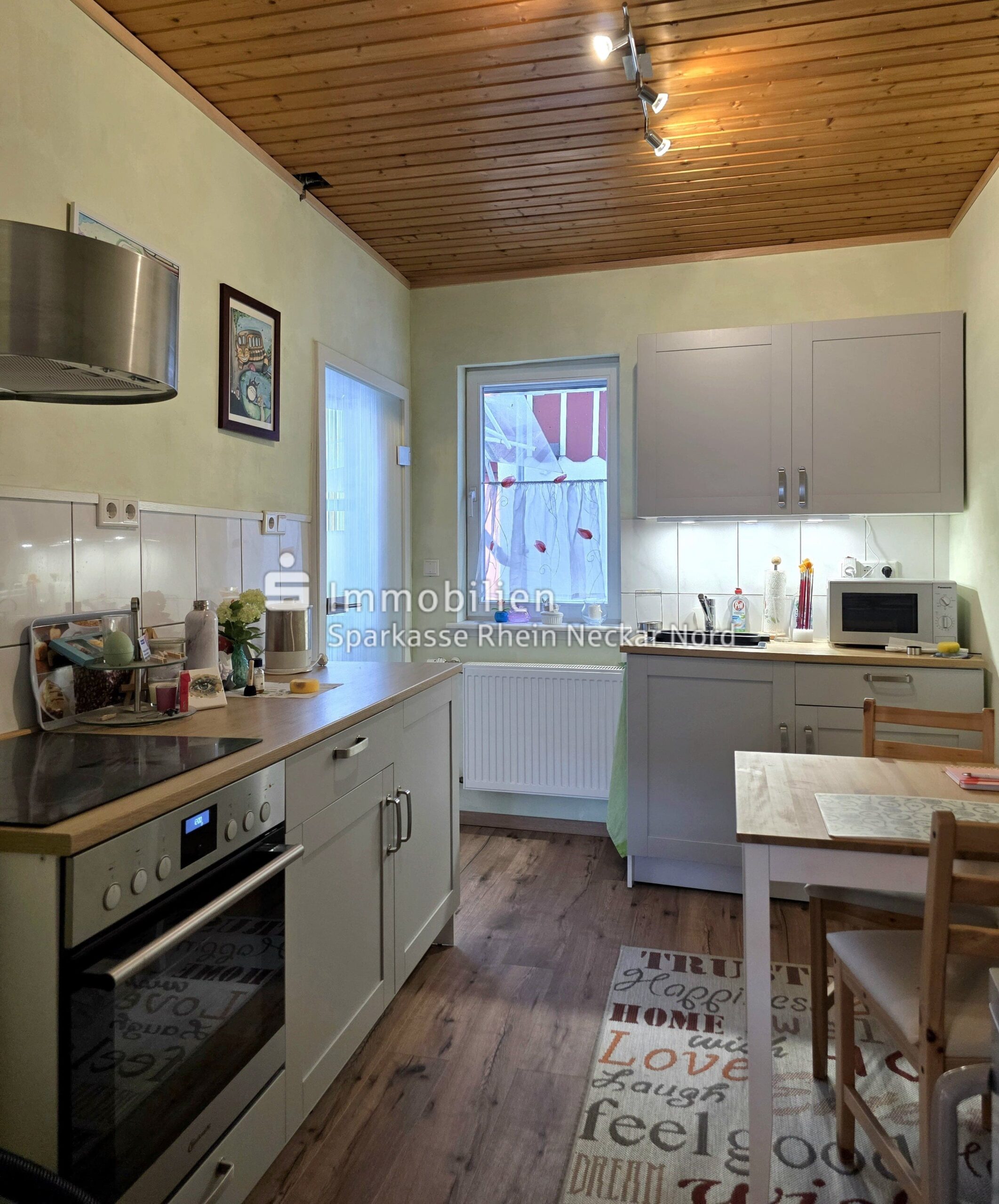 Über eine schöne Holztreppe im Landhausstil gelangen Sie ins Obergeschoss. Gleich auf der linken Seite ist die geräumige Küche, ausgestattet mit Einbaumöbel und Elektroeinbaugeräten.
