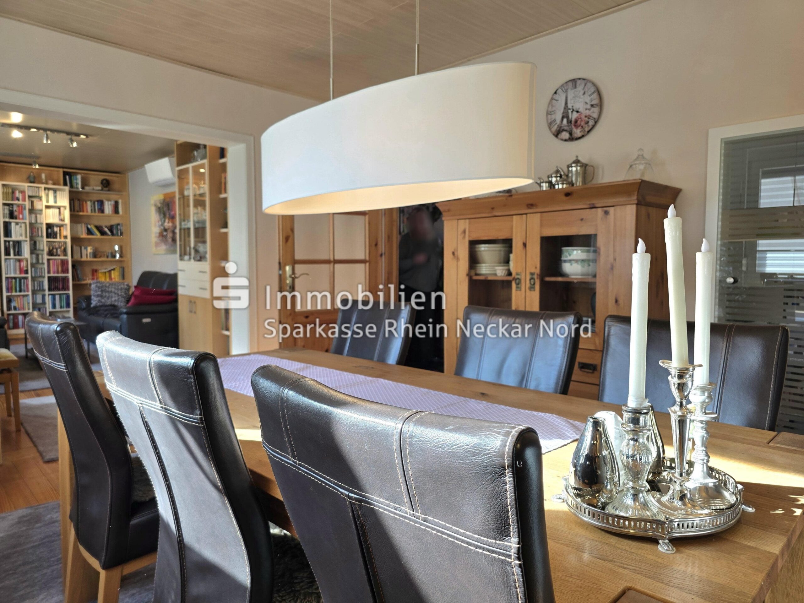 Das helle Wohn- und Esszimmer verläuft über die gesamte Hausbreite zur wenig befahrenen Seitenstraße hin. Es gibt zwei Türen, die von dort aus in den Flur führen.