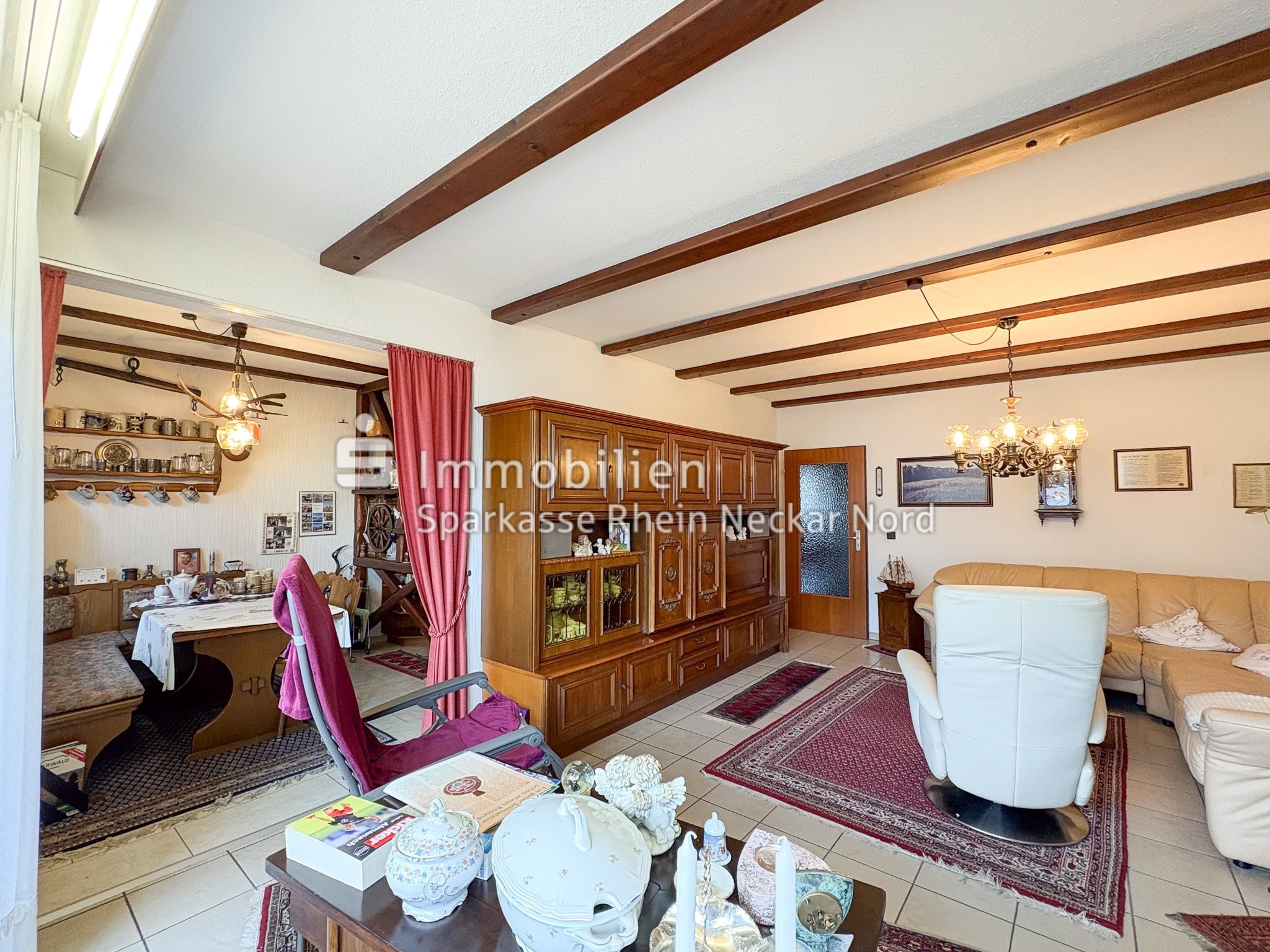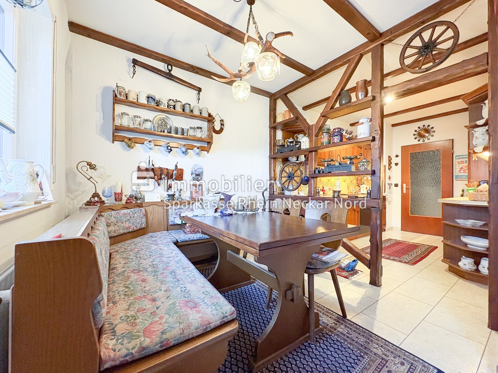 Der Wohnbereich ist offen und zugleich klar gegliedert gestaltet. Die Küche ist durch eine Holzvertäfelung vom Essbereich getrennt, wodurch eine klare Struktur entsteht und gleichzeitig ein offenes Raumgefühl erhalten bleibt. Vom Essbereich aus gelangen Sie direkt in das großzügige Wohnzimmer, das mit seiner einladenden Atmosphäre zum Entspannen und Verweilen einlädt.